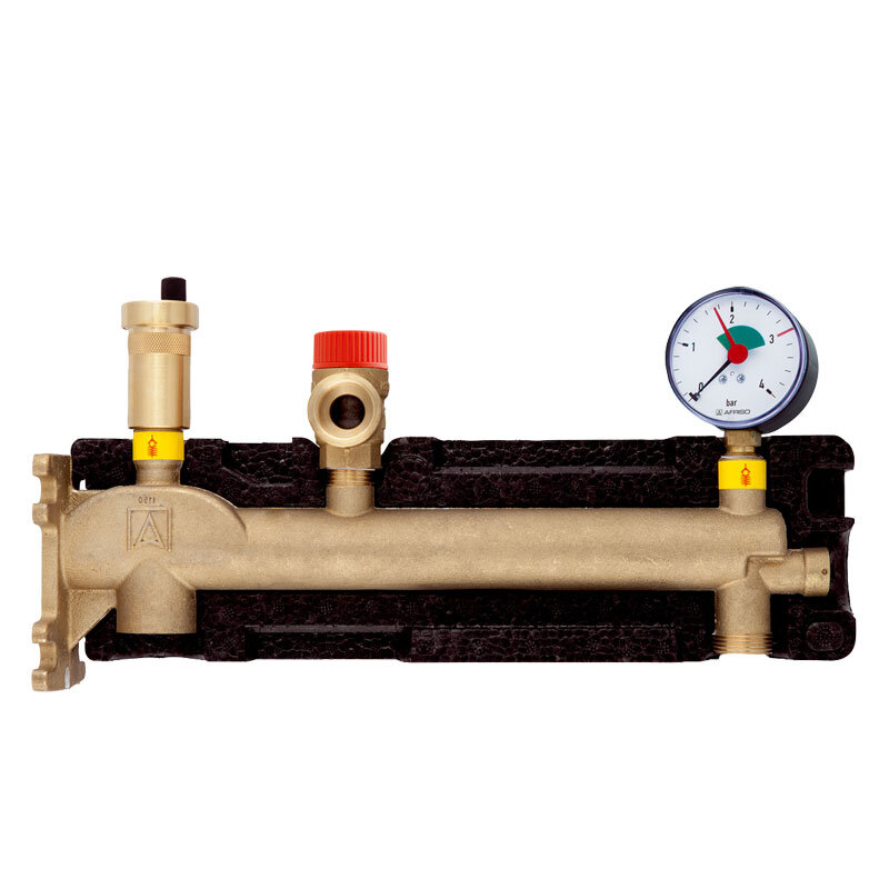 Vormontierte Kombinationsarmatur, bestehend aus: Armaturenträger aus massivem Messingguss mit integriertem Kappenventil zum Anschluss des Membranausdehnungsgefäßes. Bauteilgeprüftem Sicherheitsventil. Heizungsmanometer mit rotem Markierungszeiger, montiert über selbstdichtendem Montageventil. Schnellentlüfter (12 bar) montiert über selbstdichtendem Montageventil. Zwei formschlüssigen Isolationshalbschalen.