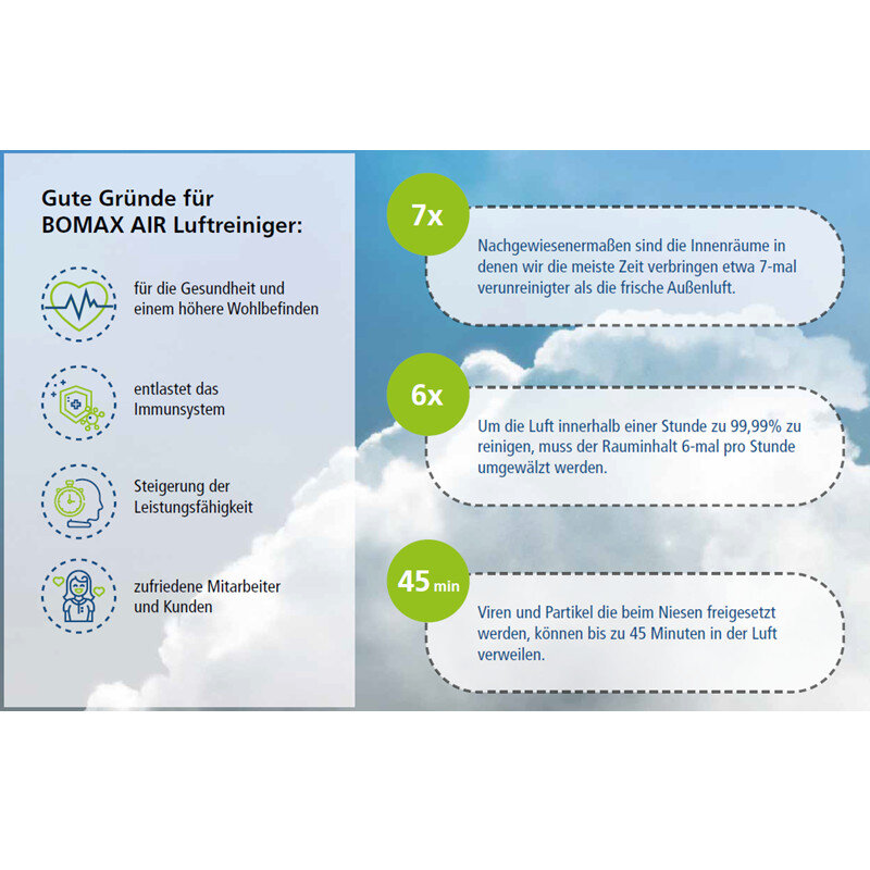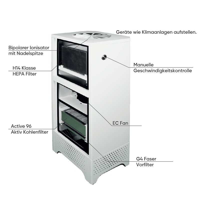 Dadurch liefert er auch an großvolumigen Standorten und in Räumen mit dichtem Personenaufkommen eine hervorragende Luftreinigung.