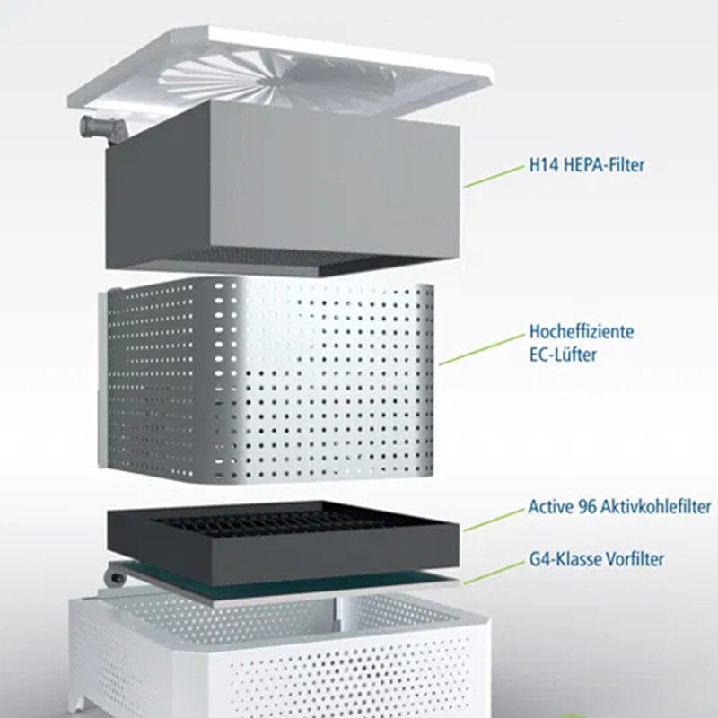 Durch die Verwendung eines G4-Klasse Vorfilter wird die Verwendungsdauer des Aktivkohlefilters verlängert und die Effizienz des HEPA 14 Filters deutlich verstärkt.