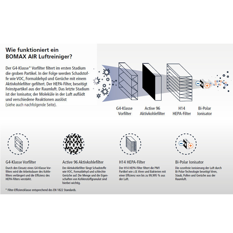 In der weiteren Phase, beseitigt der HEPA 14 Filter auch kleinste Feinpartikel, wie z.B. Viren und Bakterien aus der Raumluft.