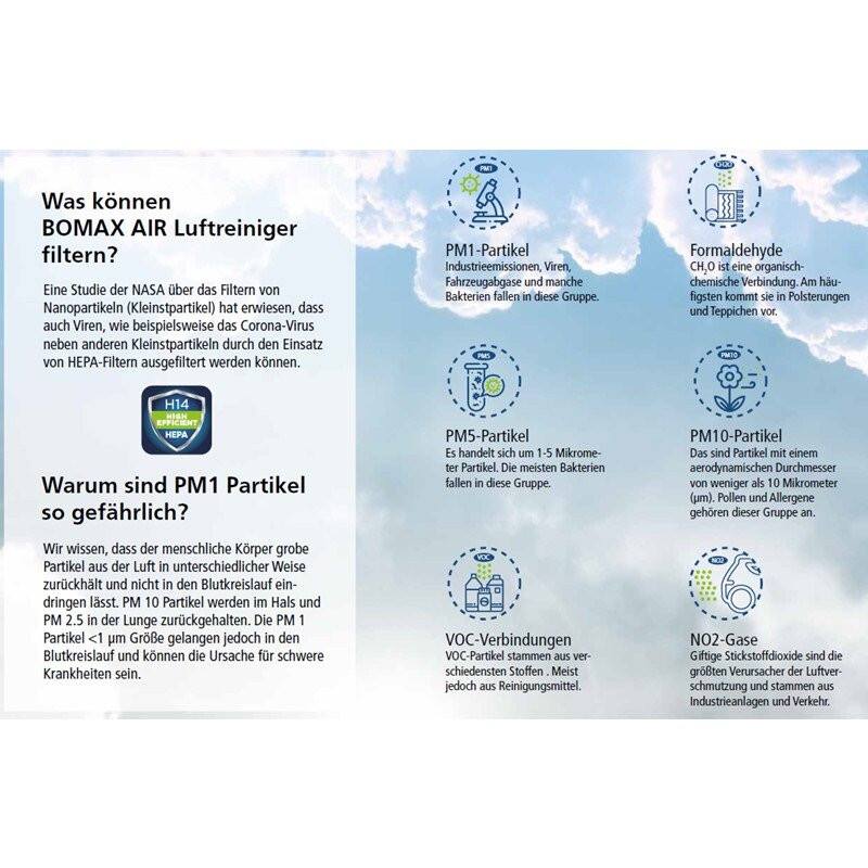 Der H14 HEPA-Filter filtert die PM1 Partikel, zu den auch Viren und Bakterien gehören, mit einer starken Effizienz von bis zu 99,995 % aus der Raumluft.