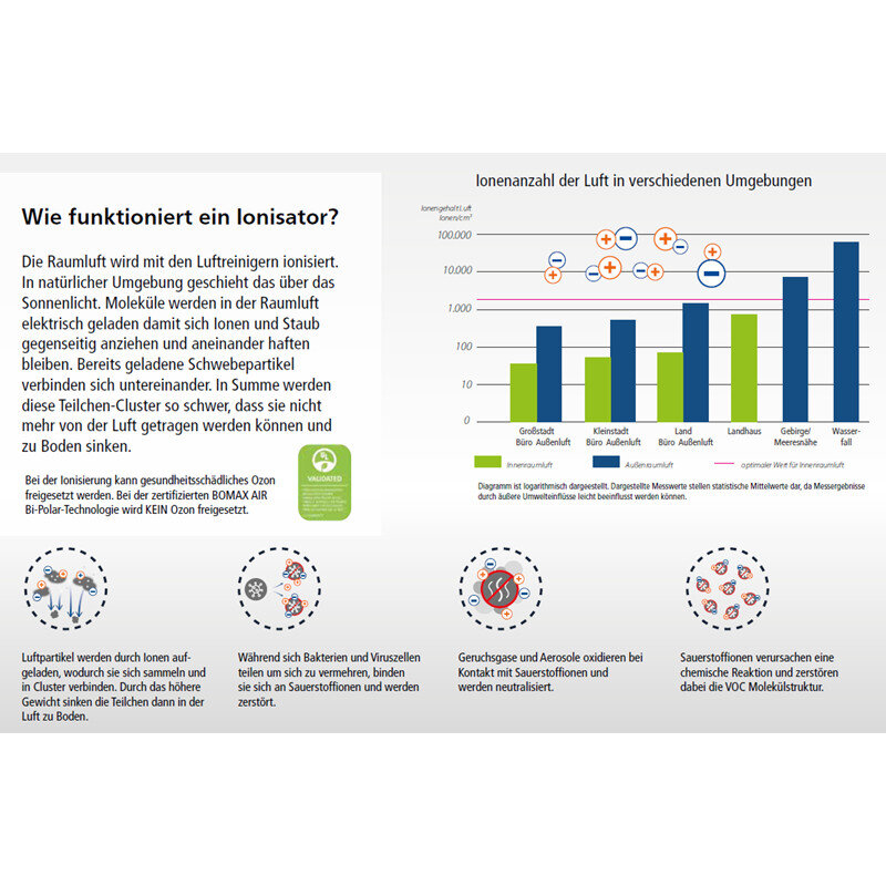 Die ozonfreie Ionisierung der Innenluft durch die Bi-Polar-Technologie beseitigt zum Abschluss Viren, Staub, Pollen & Gerüche aus der Raumluft.