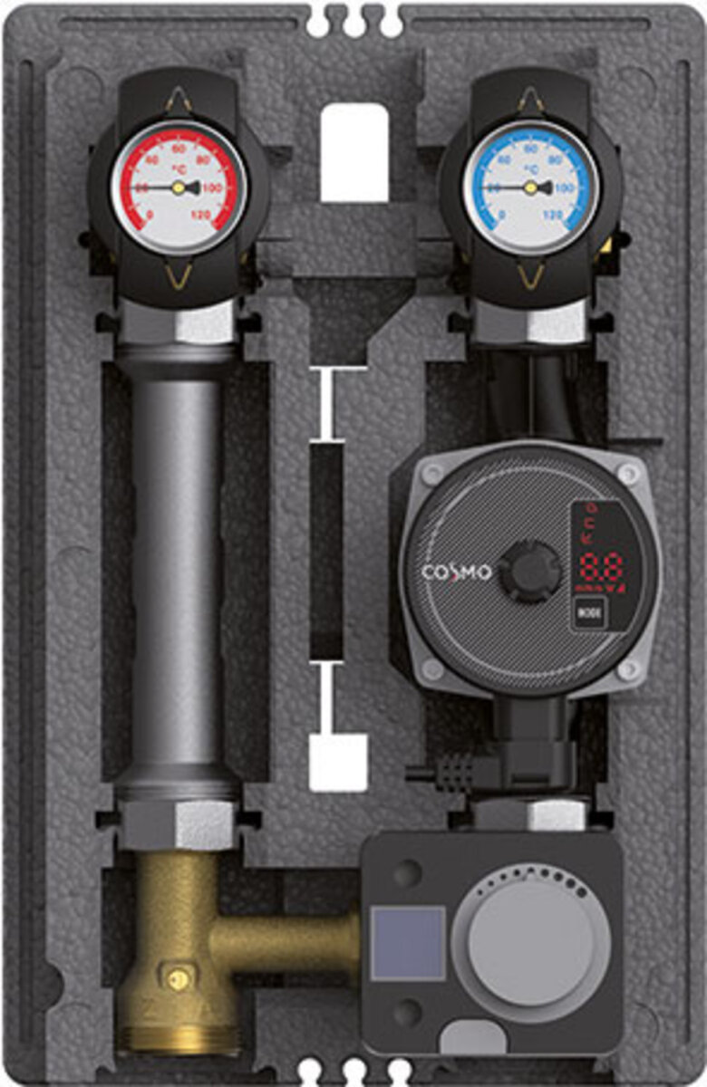 Pumpengruppe für Rücklauftemperaturanhebung elektronisch / zur Vermeidung von Kondensation im Kesselbrennraum / Anschlüsse unten 1 1/2"AG flachdichtend / Achsabstand 125mm / Ausstattung: Pumpengruppe bestehend aus COSMO Pumpe CPH 2.0 6-25 / 2 Thermometer-Kugelhähne mit Griff und Thermometer +120°C / rot / blau / im Griff integriert / 1 elektronisch geregelter 3-Wege-Mischer mit integriertem Rückflussverhinderer und Konstat-Temperaturregler 230V/50Hz Laufzeit 120 Sekunden 90° 6Nm mit Not-Handbetrieb und Stellungsanzeige / 1 Rücklaufrohr mit Rückflussverhinderer / aufstellbar / Bauteile montiert und druckgeprüft / Epp-Dämmung EnEV-komform