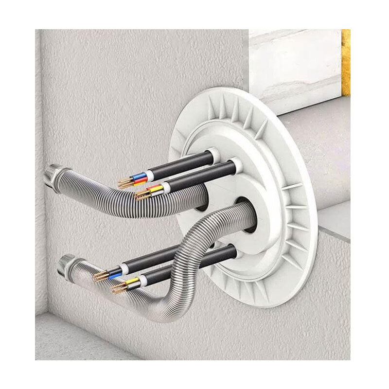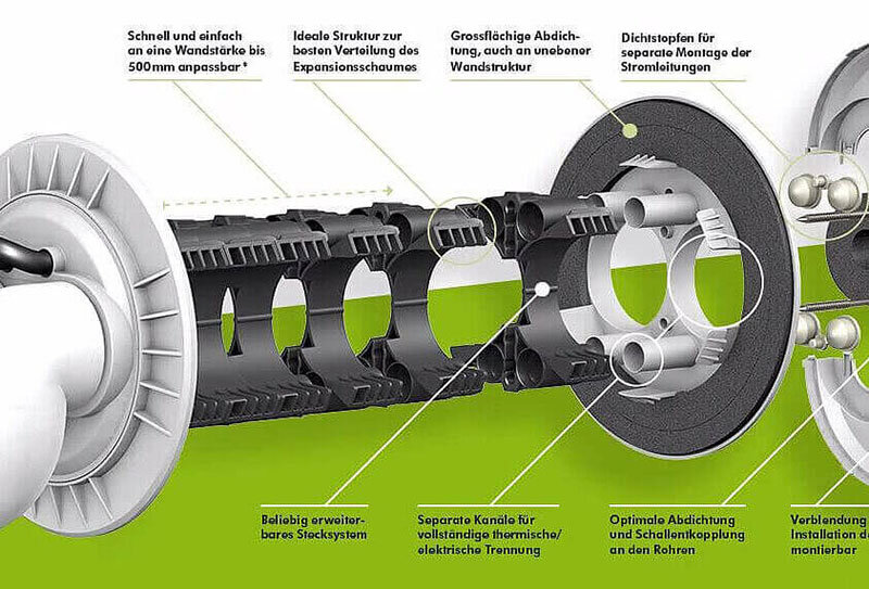 für Wärmepumpen zur luft-, gas- und wasserdichten Abdichtung von Rohren und Kabeln bei Luft-Wasser-Wärmepumpen, beidseitig abdichtend, gesicherte Wärmedämmung, getrennte Verlegung der Rohre und Kabel. Separate Führung von Spannungsund Steuerleitungen Universeller Einsatz in allen gängigen Wandaufbauten. Flexible Abdichtung der Leitungen möglich. Max. 2 Kupferrohre mit Außendurchmesser 22, 28 oder 35 mm. Max. 4 Energie- bzw. Steuerkabel mit Außendurchmesser 5 - 17 mm. Einsatz in bauseitiges Futterohr oder Kernbohrung DN 200. Individuelle Anpassung an bauseitige Wandstärken möglich bis 500 mm.