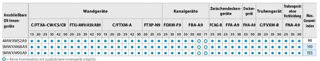 Auch die Auswahl Ihrer Innengeräte ist variabel. Sie können sich z. B. für Wand-, Truhen- oder Deckgeräte und zusätzlich für einen Warmwasserspeicher entscheiden. Sie treffen Ihre Entscheidung ganz nach Ihren persönlichen räumlichen Vorgaben. Auszeichen lässt sich dieses Außengerät durch einen geringen Geräuschpegel und einem geringen Energieverbrauch.