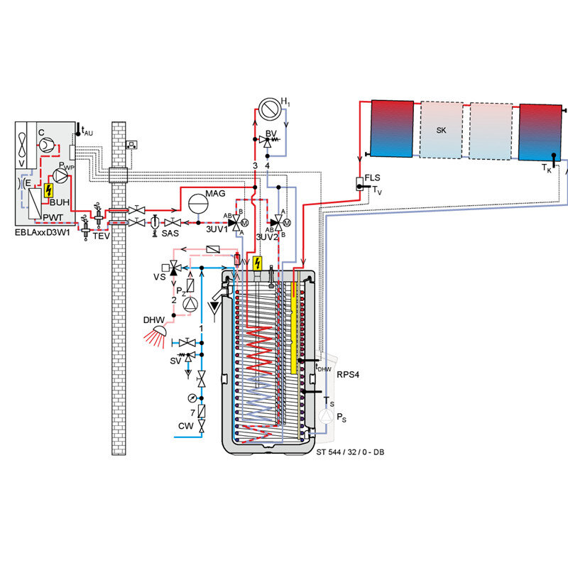 Da nur wasserseitige Anschlüsse notwendig sind, kann die Wärmepumpe besonders einfach und schnell installiert werden. Lediglich der Wärmespeicher mit integrierter Wärmepumpensteuerung und ggf. der Reserveheizstab wird im Gebäude eingebunden.