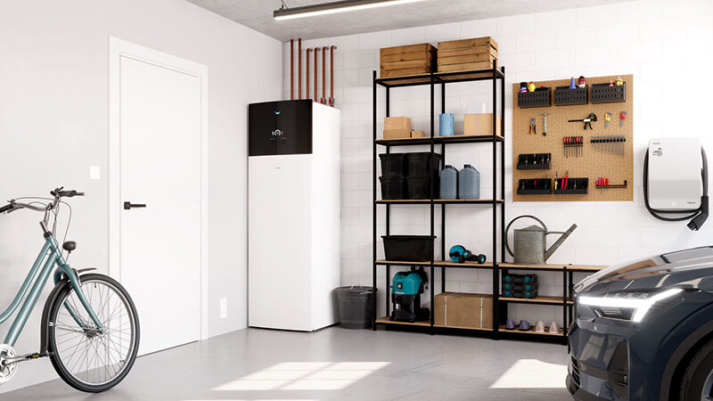 Gut geschützt und unauffällig: Die Stromversorgungs- und Kältemittelanschlüsse befinden sich oben am Warmwasserspeicher.