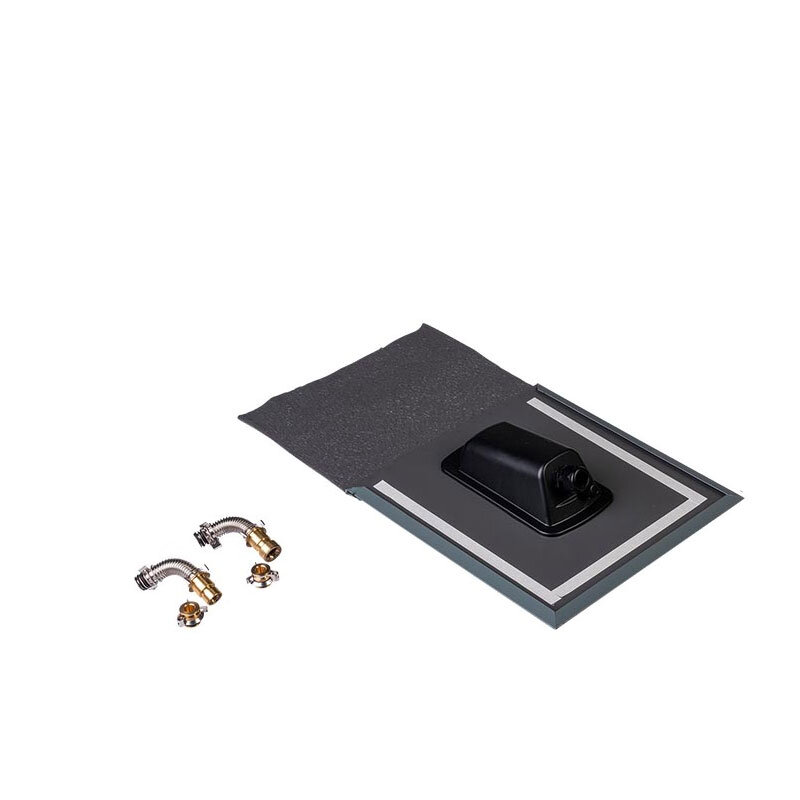 Dachdurchführungspaket mit Anschlussfittings und Kollektormontagematerial, bestehend aus Dachdurchführungen in Anthrazit, Montagematerial für Kollektor und Verbindungsleitung, 2 Meter UV-beständiger Wärmedämmung für den Außenbereich, Anschlussfittings mit Lösewerkzeug und Kollektortemperaturfühler.