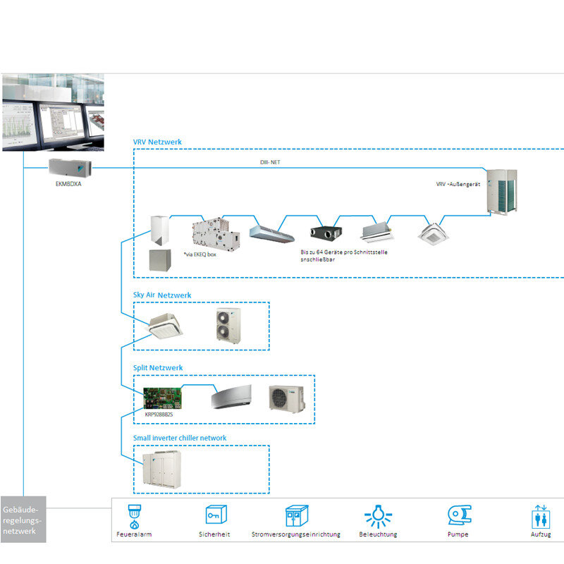 Integriertes Regelungssystem für einfache Verbindung zwischen Split-, SkyAir-, VRV-, Kaltwassersatz-, AHU- und BMS-Systemen | Kommunikation über Modbus-RS485-Protokoll | Detaillierte Überwachung und Regelung der VRV-Gesamtlösung | Problemlose und rasche Installation über DIII-Net-Protokoll