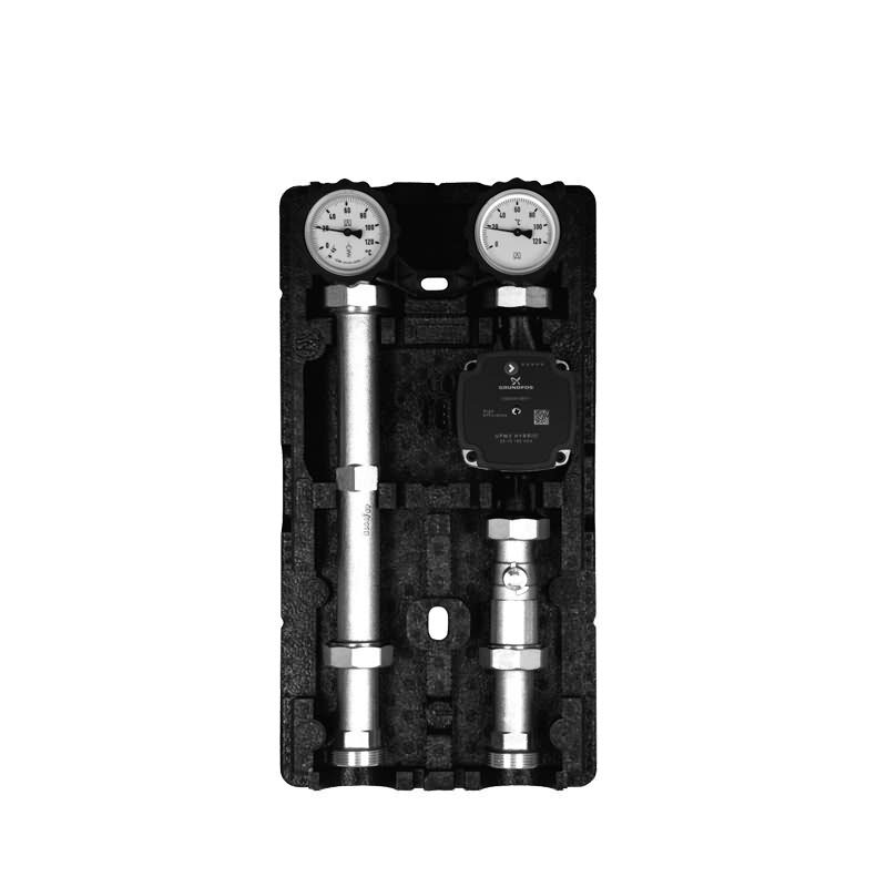 Vormontierte, dichtheitsgeprüfte und wärmegedämmte Baugruppe. Inkl. Temperaturanzeigen und aufstellbarer Schwerkraftbremse. Mit Grundfoss Pumpe UPM 3 hybrid 25-70/180. Anschluss G1, ohne PWM-Kabel.
