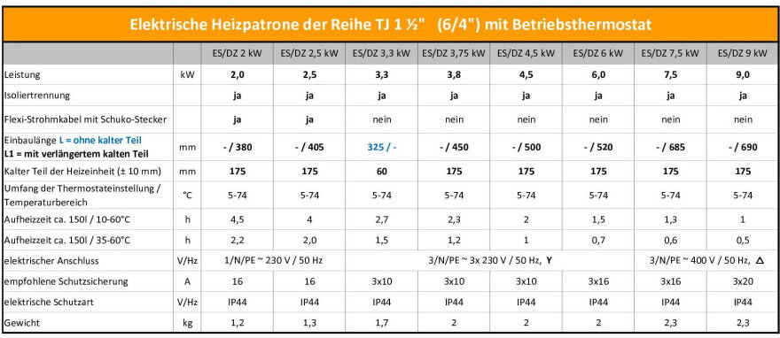 Je nach Speichergröße stehen verschiedene Leistungsgrößen von 2,0 kW bis 9,0 kW (mit bzw. ohne Steckerkabel) zur Verfügung. Die Einschraubheizkörper werden bei 2,0 und 2,5 kW einphasig für 230V geschaltet und ab 3,3 kW dreiphasig für 380V.