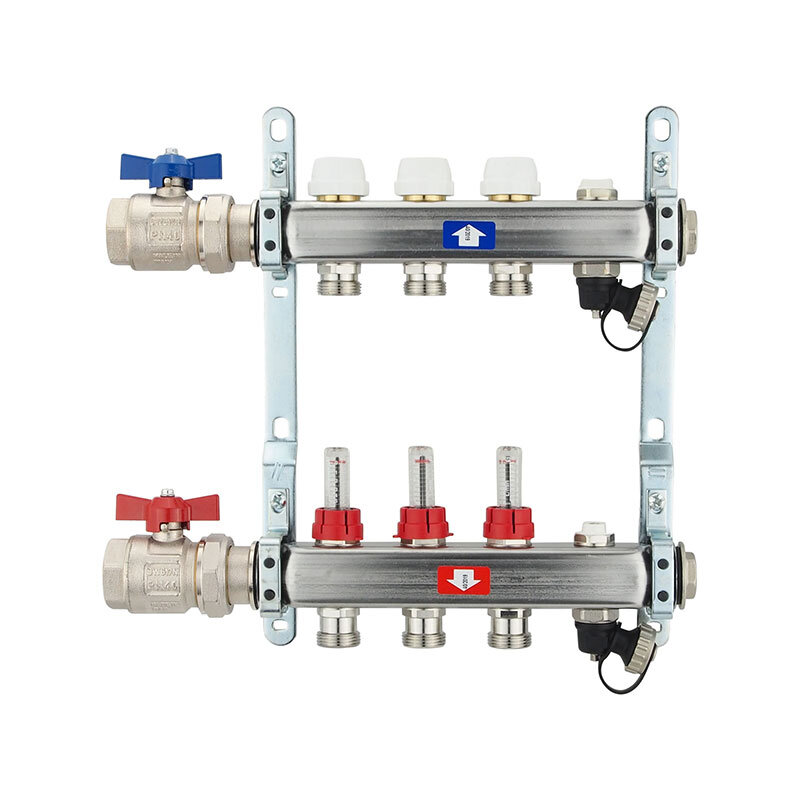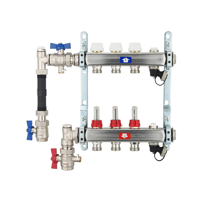 Fußbodenheizungsverteiler aus Edelstahl mit Topmeter für 3 Heizkreise.