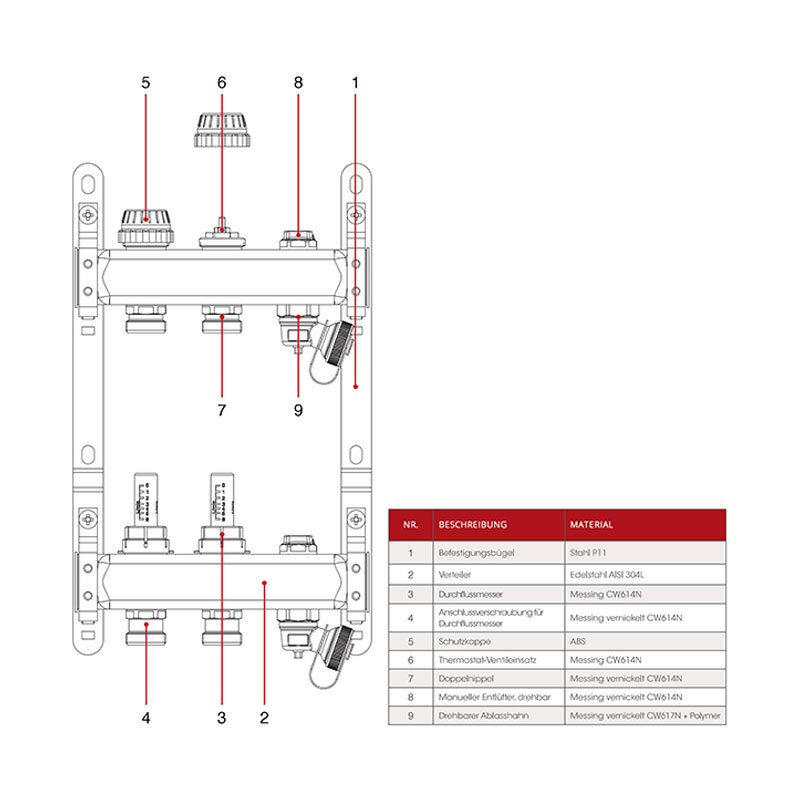 Robuste Oberfläche: Edelstahl AISI 304L | Modernes, edles Design | Höhere Durchflusswerte dank größerem Querschnitt der Stäbe | Mehrere Verteiler einfach kombinieren und verbinden mit optional erhältlichem Doppelnippel | Ventilober- und -unterteil selbst zentrierend | Genaue Adaptierung des Ventil-Schließmaßes, da alles aus einer Hand | Rücklaufventile zur Aufnahme elektrischer Stellantriebe vorbereitet | Eingebaute Topmeter ermöglichen hydraulischen Abgleich | Durchfluss durch Handradverstellung manuell regulierbar | Flache Metallbügel mit schalldämmenden Gummieinlagen | Montagefreundlich durch versetzt angeordnete Verteilerbalken | Versorgungsleitungen können durch einfaches Drehen der Verteilerbalken links- oder rechtsseitig angeschlossen werden | Integriertes Entlüftungsventil und vormontierte Wartungshähne | Verschiedene Größen und Ausführungen für jeden Einsatzzweck