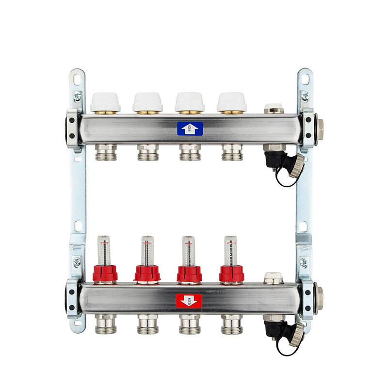 Fußbodenheizungsverteiler aus Edelstahl mit Topmeter für 4 Heizkreise.