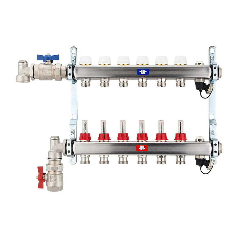 Fußbodenheizungsverteiler aus Edelstahl mit Topmeter für 6 Heizkreise.