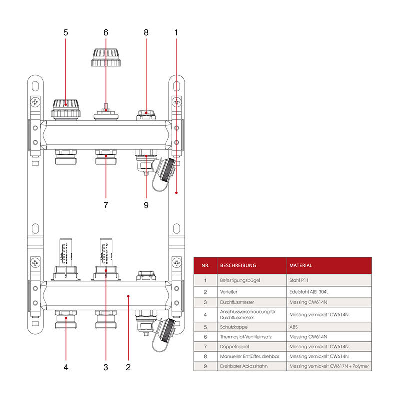 Robuste Oberfläche: Edelstahl AISI 304L | Modernes, edles Design | Höhere Durchflusswerte dank größerem Querschnitt der Stäbe | Mehrere Verteiler einfach kombinieren und verbinden mit optional erhältlichem Doppelnippel | Ventilober- und -unterteil selbst zentrierend | Genaue Adaptierung des Ventil-Schließmaßes, da alles aus einer Hand | Rücklaufventile zur Aufnahme elektrischer Stellantriebe vorbereitet | Eingebaute Topmeter ermöglichen hydraulischen Abgleich | Durchfluss durch Handradverstellung manuell regulierbar | Flache Metallbügel mit schalldämmenden Gummieinlagen | Montagefreundlich durch versetzt angeordnete Verteilerbalken | Versorgungsleitungen können durch einfaches Drehen der Verteilerbalken links- oder rechtsseitig angeschlossen werden | Integriertes Entlüftungsventil und vormontierte Wartungshähne | Verschiedene Größen und Ausführungen für jeden Einsatzzweck