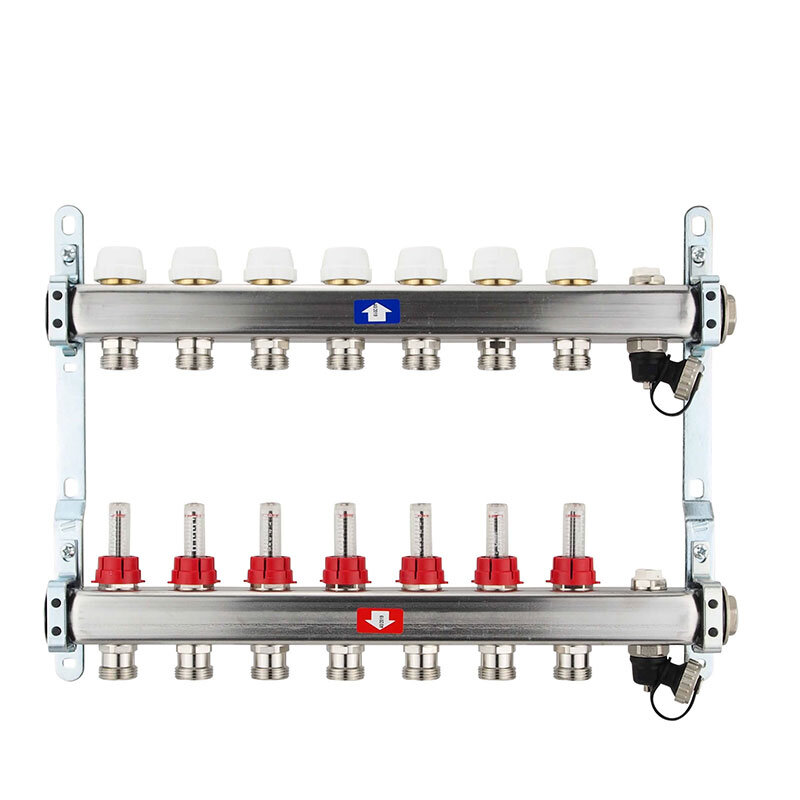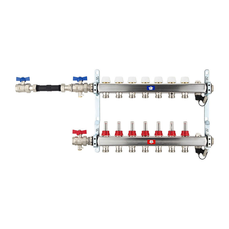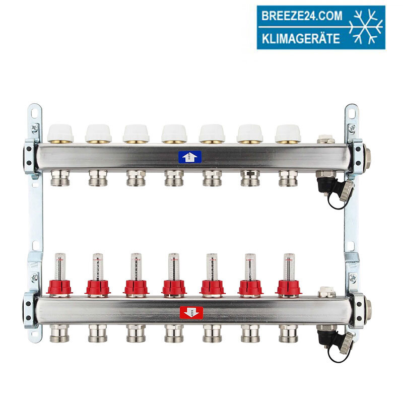 Fußbodenheizungsverteiler aus Edelstahl mit Topmeter für 7 Heizkreise.