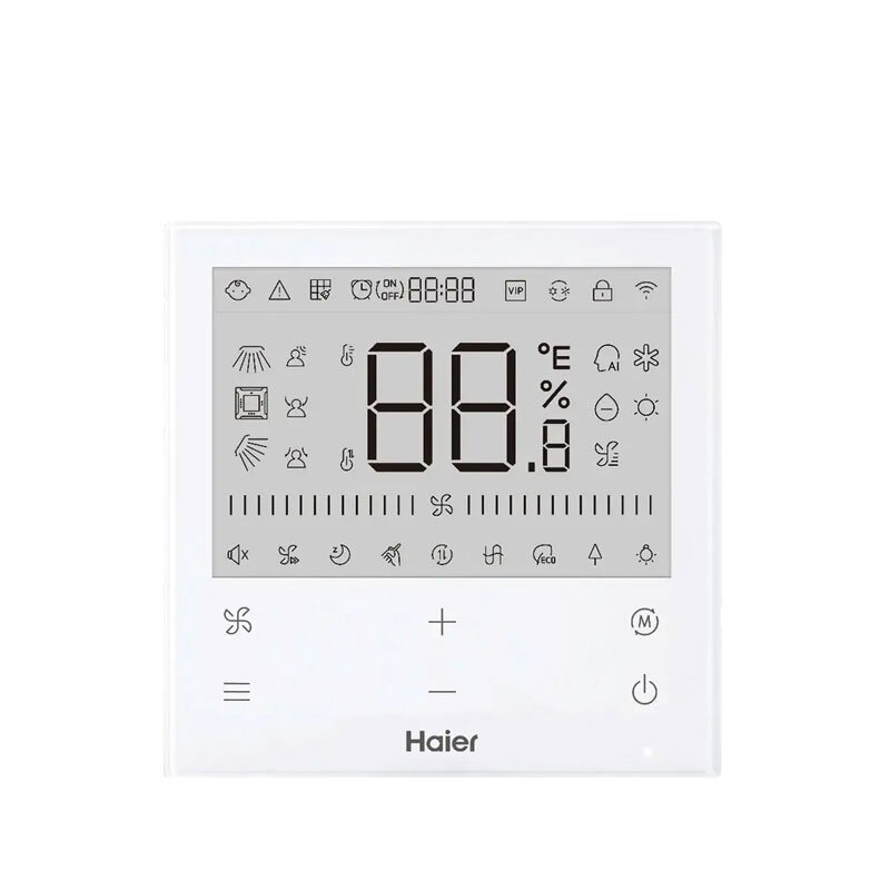 Steuerung für HAIER Single- und Multi-Split-Innengeräte, monochromes hintergrundbeleuchtetes LCD-Display, kompakte Größe und elegantes Design, weiße Farbe mit Touch-Taste. Es verwaltet bis zu 16 Innengeräte mit der gleichen Betriebsart.
