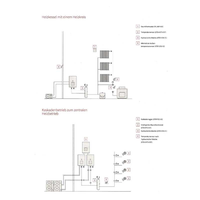 Alle Anschlüsse nach unten ausgeführt. Dies ermöglicht eine schnelle Anbindung an das Rohrnetz bzw. reduziert die Montagefreiräume. Optional kann bauseits ein 3 Wegeventil eingebunden werden, welches je nach Anwendung vom System automatisch vom Heizmodus (bzw. optional Kühlen) in die Warmwassererwärmung umschaltet (WW Tank optional oder bauseitig).