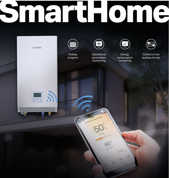 Kaisai-Produkte verfügen über eine Reihe von Komfortfunktionen, wie z. B. neue Steuerungsoptionen, die die Steuerung einer Wärmepumpe so komfortabel und einfach wie noch nie machen. Fernsteuerung per App auf einem Smartphone oder Tablet. Überprüfung des aktuellen Zustands der Einheiten, Umschalten der Zonen, Regelung der Zulauf- und Warmwassertemperaturen. Anzeige von Fehlerinformationen. Anzeige des aktuellen Energieverbrauchs.