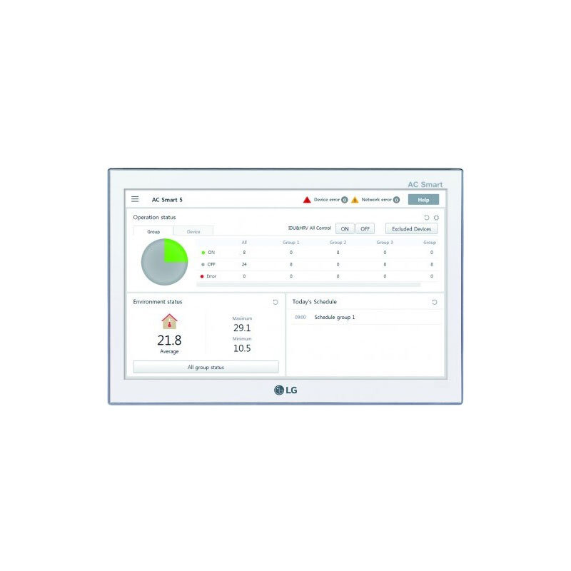 LG Electronics Zentrale Steuerung AC-Smart 5 für die Steuerung der Luft-Wasser-Wärmepumpe. Über das 10,2" Touch-Screen der AC-Smart 5 ist es möglich mehrere Klimageräte zentral zu steuern. Es ermöglicht die individuelle Überwachung und Steuerung von bis zu 128 Inneneinheiten mittels RS485-Protokoll.