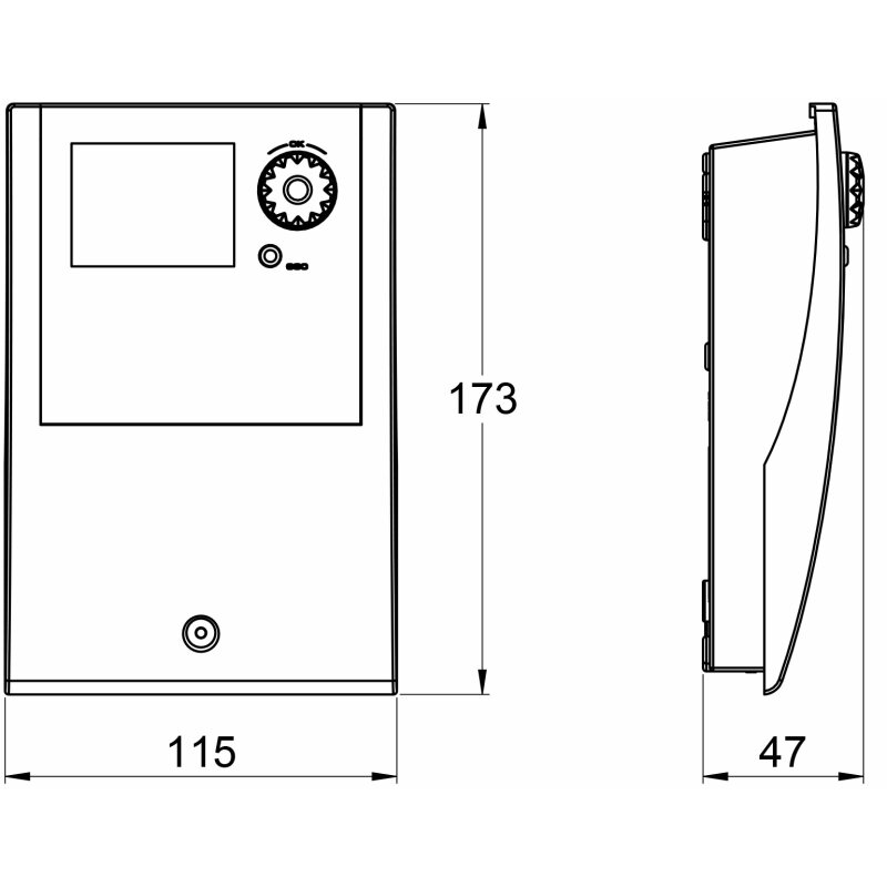Nennspannung: 230 VAC, 50 Hz | Leistungsaufnahme: 3,5 VA | Schutzart: IP 20 | Schutzklasse: II | Anzeige: TFT-Farbdisplay 47 x 35 mm mit Hintergrundbeleuchtung | Triac-Ausgänge: 230 VAC ± 10%, 1 A, 200 VA | Relaisausgang: Max. 240 VAC, 4 A | Fühlertyp: PT 1000 | Hocheffizienzpumpe: Analogausgang 0 -10 V, max. 10 mA PWM Ausgang 100 Hz - 2 kHz