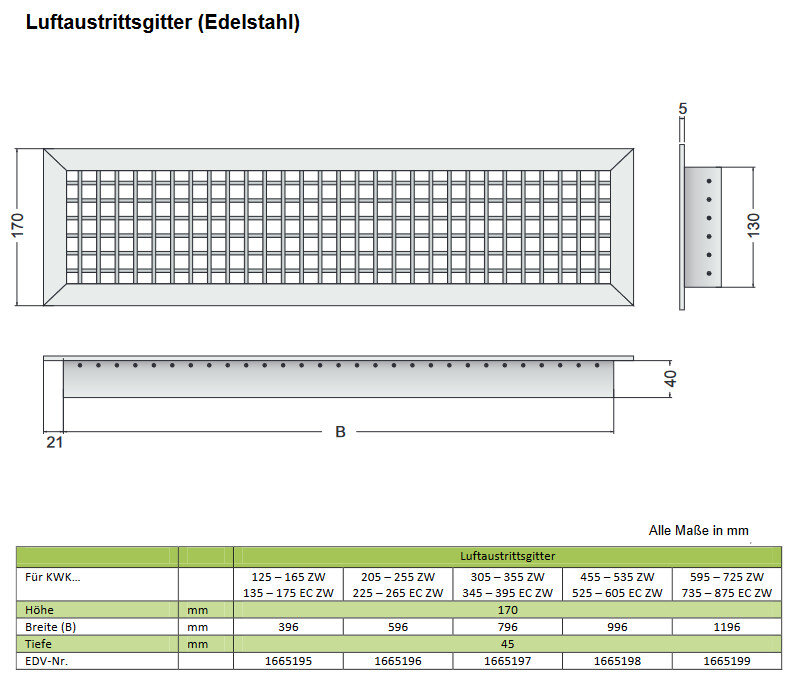 Luftaustrittsgitter Edelstahl für KWK Kanalgeräte