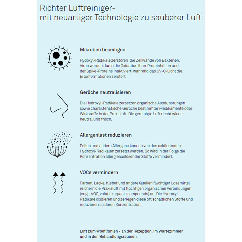 Das Richter MSP-System reinigt die Raumluft nach demselben Prinzip. Die erzeugten Radikale vernichten im Innern der Reaktionskammer nahezu alle organischen Bestandteile wie Bakterien, Viren, Pilzsporen, Lösemittelreste, usw.