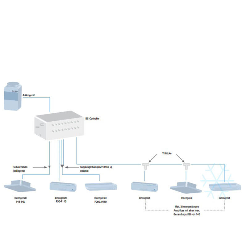 Innengeräte der Baugröße 100 - 250 belegen zwei Abgänge am BC Controller. Mit dem Kupplungsstück lassen sich zwei Abgänge passgenau zusammenführen.