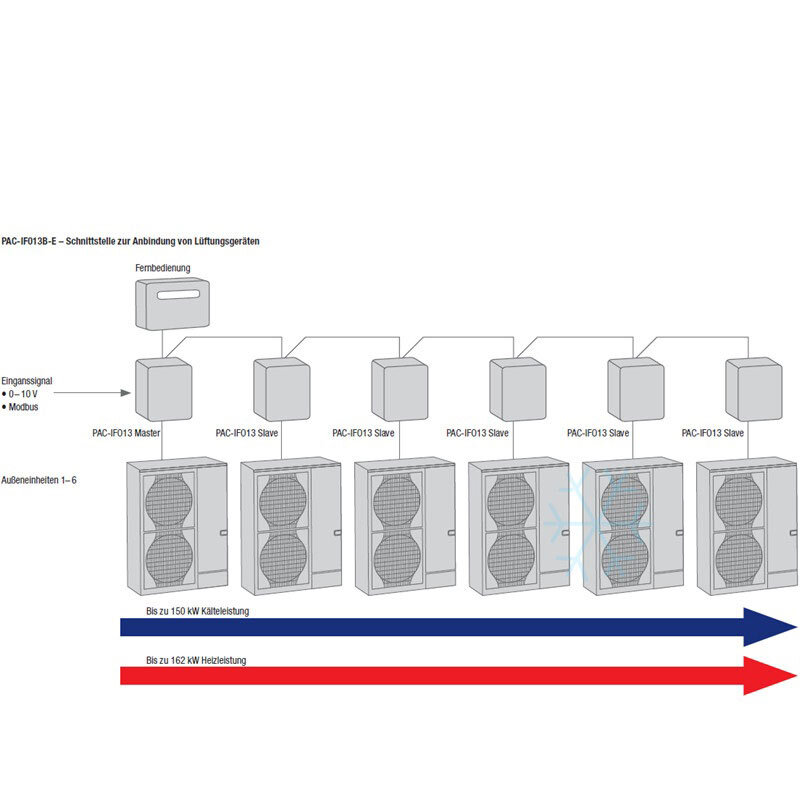Das PAC-SIF013 übernimmt bei einer Kaskadensteuerung die Slave-Funktion, während das PAC-IF13B die Master-Funktion übernimmt. (Siehe Bild)