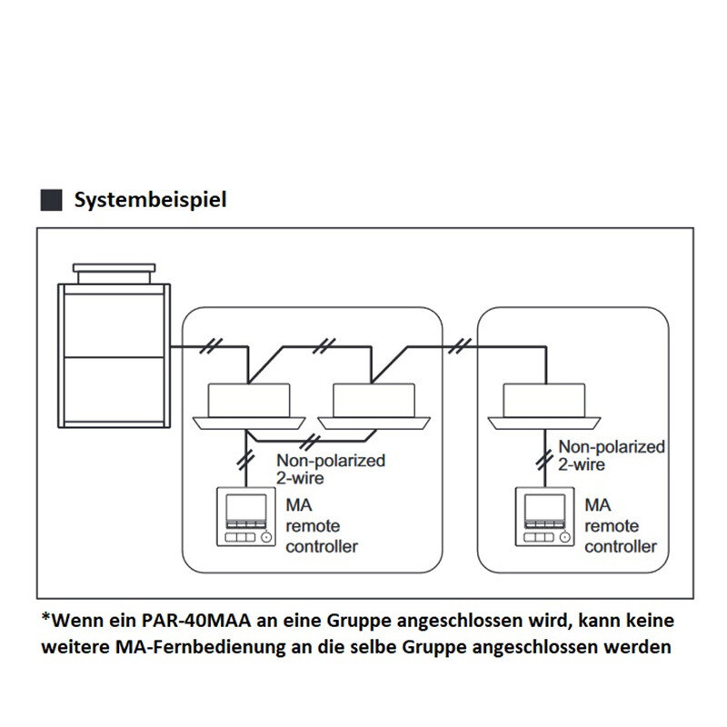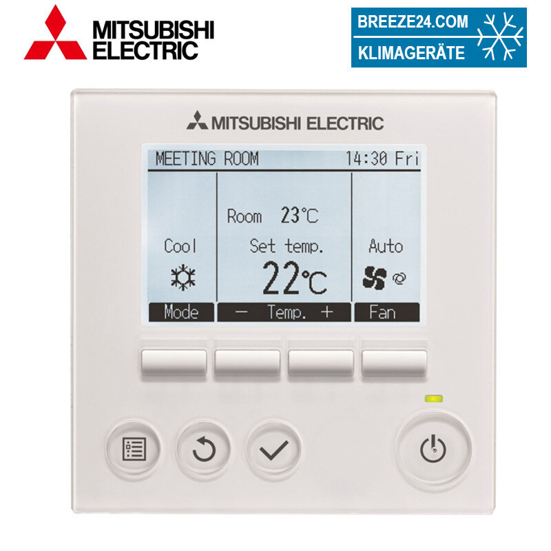 Die MA-Kabelfernbedienung wird direkt am Innengerät angeschlossen, die Gruppenbildung erfolgt durch Verdrahtung der Innengeräte. | Modernes Design, flache Bauweise für Wandmontage. | Die Eingaben erfolgen mittels vier Funktionstasten, die unter dem vollgrafischen Display mit Hintergrundbeleuchtung angeordnet sind. | Mit weiteren drei Tasten für die wichtigsten Funktionen wird die Bedienung einfach und schnell. | Mit der großen Ein-/Aus-Taste wird das Klimagerät mit den zuletzt gewählten Einstellungen bedient. | Deutschsprachige Menüs erleichtern die Bedienbarkeit. | Dual-Setpoint-Funktion für eine individuelle Temperaturvorgabe im Kühl- und Heizmodus.