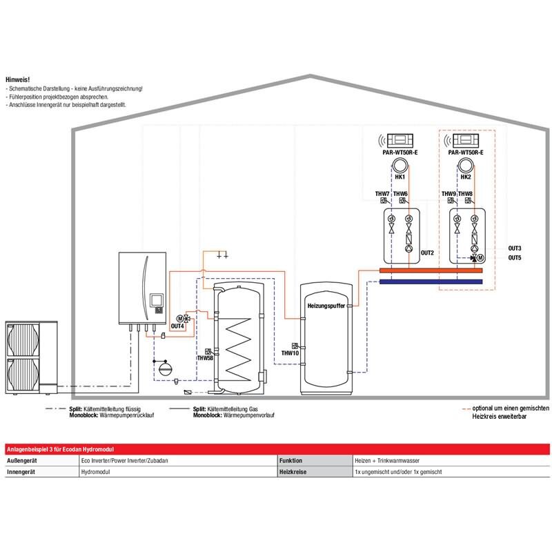 Mit der Ecodan-Wärmepumpe können zwei Heizkreise mit unterschiedlichen Vorlauftemperaturen geregelt und damit zwei unterschiedliche Wärmeverbraucher, z. B. Heizkörper und Fußbodenheizung, gesteuert werden. Darüber hinaus wurde die Steuerung des Mischventils optimiert, um den Komfort der zweiten Zone zu verbessern, indem vorrangig die im Pufferspeicher gespeicherte Wärme genutzt wird. Dadurch wird ein häufiges Ein- und Ausschalten der Wärmepumpe bei einer Zwei-Zonen-Regelung vermieden.