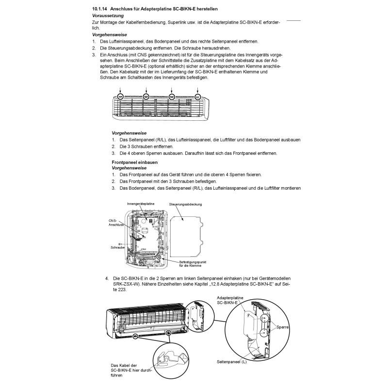 Der Anschluss des Inngeräts mit der SC-BIKN-E Adapterplatine erfolgt mittels CNS-Kontakt, welcher gleichzeitig die Platine mit Spannung versorgt. Die Adapterplatine stellt zwei 2-adrige Fernbedienungsbusanschlüsse (Klemmen-X/Y), ein Adressen-Drehschalter, ein CNROM-Anschluss und ein CNT-Anschluss für ein externes Signal zur Verfügung.