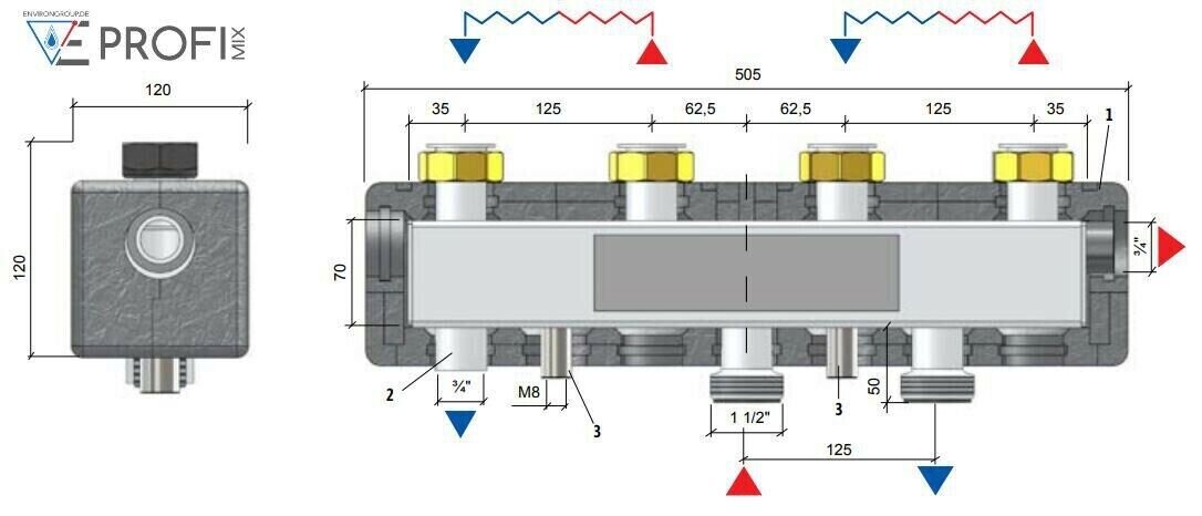 Der Achsabstand beträgt 125mm und die Abmessung der unteren Anschlüsse 1½“ AG für eine möglichen direkten Einbau auf einen herkömmlichen Verteilerbalken. Im Lieferumfang sind Reduzierstücke (Überwurfmutter 1 ½“ auf 1“ IG) enthalten. Die durchdachte Wärmedämmung aus EPP, mit einem Dampfsperren-System, sorgt für ein optimales Klima im Inneren der Dämmung, so dass keine Wärmestaus entstehen. Mit einem einfachen Handgriff ist es möglich vom Heizmodus in den Kühlmodus umzuschalten. Wenn mehrere Pumpengruppen der Serie PROFI MIX eingesetzt werden, ergeben die einzelnen Dämmungselemente zusammen mit dem Verteilerbalken eine formschöne, perfekte Einheit.