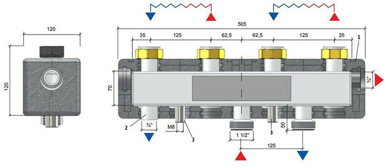 Verwaltung von Mehrfach-Heizungszonen möglich | Aus viereckigem Profil hergestellt | Thermische Isolierung aus schwarzem EPP | Vorlaufkammer zu Ø 38 (DN40) | Rücklaufkammer zu Ø 38 (DN40)