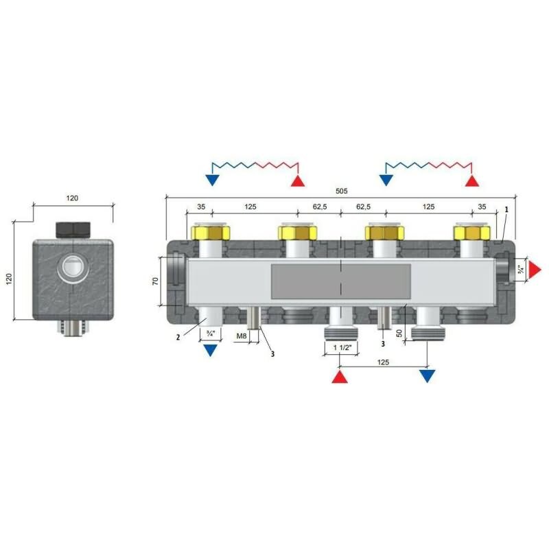 Werkstoff Verteiler: Stahl ST37.1 | Isolierung: EPP 40 g/l | Max Leistung: 83 kW | Max Druck: 6 bar | Max Temperatur: 120°C