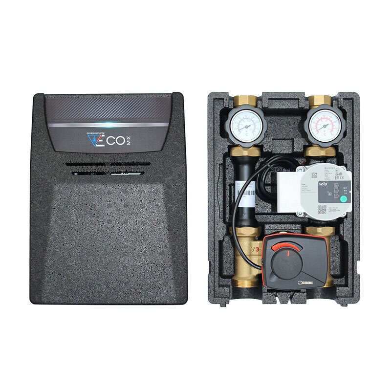 Die Pumpengruppe EcoMix ENH001 ist eine einbaufertige, professionelle Pumpengruppe für Heizkreise wie Fußbodenheizung, Wandheizung, Radiatoren usw. mit eingebauten Drei-Wege-Mischer aus Messing und einem Esbe Ara 661 elektrischem Stellmotor. Verbaut ist eine Wilo Para 25/6 Hocheffizienzpumpe. Vor- und Rücklauf können einfach von rechts nach links umgekehrt werden. Im oberen Bereich der Pumpengruppe befinden sich flachdichtende Absperrventile (1“ IG) mit eingebauten Thermometern (0-160°C) und integrierter Schwerkraftbremse. Wartung oder Austausch der Umwälzpumpe ist sehr einfach, ohne dass die Anlage entleert werden muss.