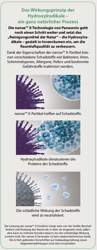 Dank innovativer nanoe™ X-Technologie können wir diese „natürliche Reinigungskraft“ auch in Innenräumen nutzen, um mit saubereren Oberflächen, Stoffen und Einrichtungen eine angenehme Wohlfühlumgebung zu schaffen: zu Hause, bei der Arbeit, in Hotels, Geschäften, Restaurants usw. Die Inaktivierungsleistung von nanoe™ X hängt dabei stets von der Größe, Umgebung und Nutzung des Raums ab.