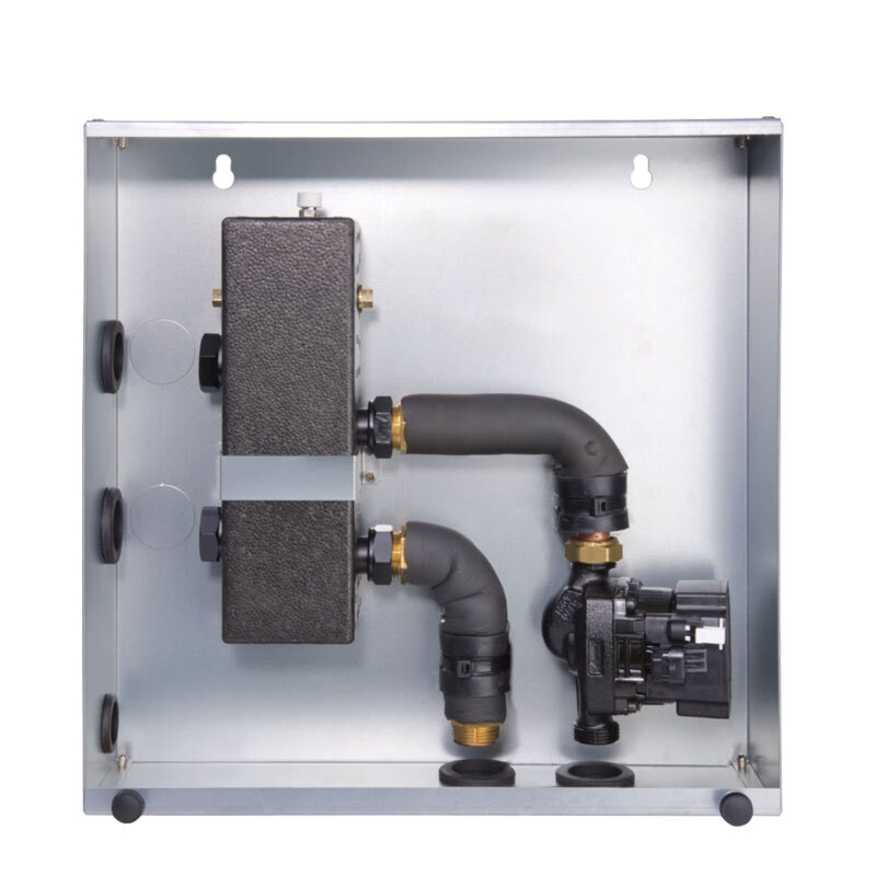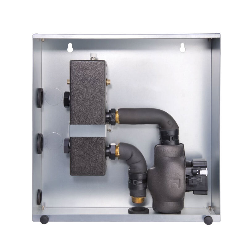 Inkl. Hydraulische Weiche | Inkl. Hocheffizienzpumpe | alle Bauteile sind komplett gedämmt inkl. der Anschlussleitungen | Anschlüsse: 1" IG Sekundär, 1" AG Primär | Volumen Weiche 1 Liter | Pumpenförderhöhe max.: 76 kPa | Pumpenregelung: Variable Drehzahl | Abmessungen (HxBxT): 457 x 457 x 133 mm | Befestigung: Wandhängend