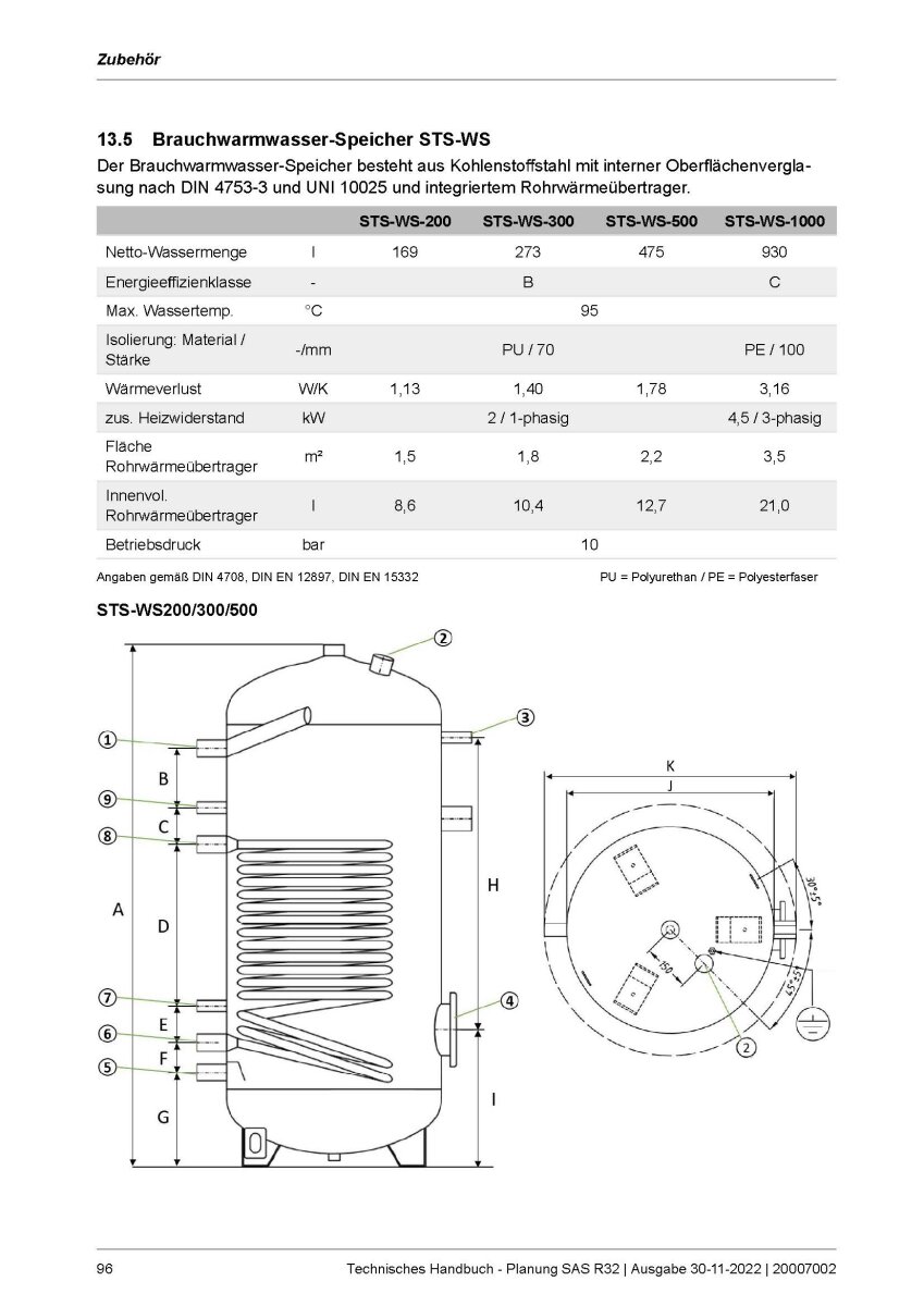 S-Klima STS-WS-300 Brauchwasser Speicher 300 Liter + Heizstab 2.0 kW + 1 Wärmetauscher für Serie SAS