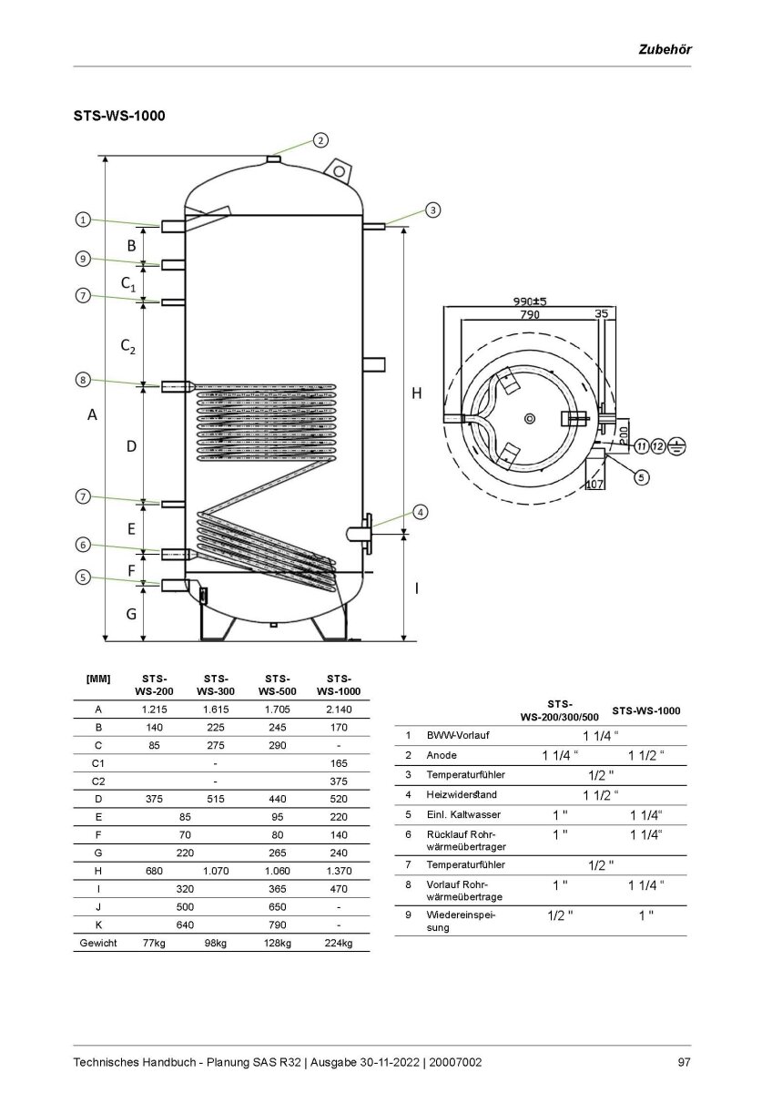 S-Klima STS-WS-500 Brauchwarmwasser Speicher 500 Liter | Heizstab 2.0 kW | 1 Wärmetauscher für Serie SAS.