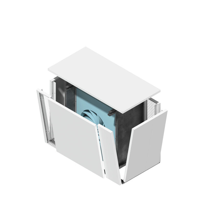 Seine flexible Konstruktion erlaubt die Luftströmung am Ein- und Ausgang in mehrere Richtungen zu richten und dadurch die Einsatzmöglichkeiten zu erweitern. Die Kondensatwasserableitung wird durch den durchlässigen Teil des Bodengrundrahmens der Schallschutzhaube sichergestellt.