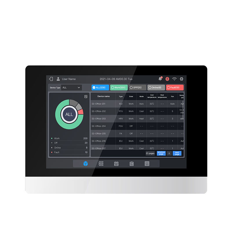 10,1" Touch-Display | Bis zu 384 Inneneinheiten (6 XYE Ports für je 64 Inneneinheiten) individuell einstellbar | Priorität für Kühlen oder Heizen einstellbar | Temperaturgrenzen für Kühlen und Heizen einstellbar | Bedienung über PC / Internet möglich | Durch Gruppierung der Geräte wird die Bedienung des Systems erleichtert und anschaulich gemacht. | Zeitpläne einstellbar – Tages-, Wochen-, Jahres-Timer
