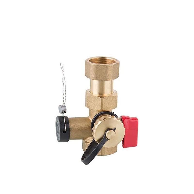 Kappenventil mit Plombiervorrichtung, mit KFE-Hahn. Uum Einbau in die Leitung vor dem Ausdehnungsgefäß. Montage des Entleerungsventil ist so einzudichten, daß der Ablaufstutzen nach unten zeigt.