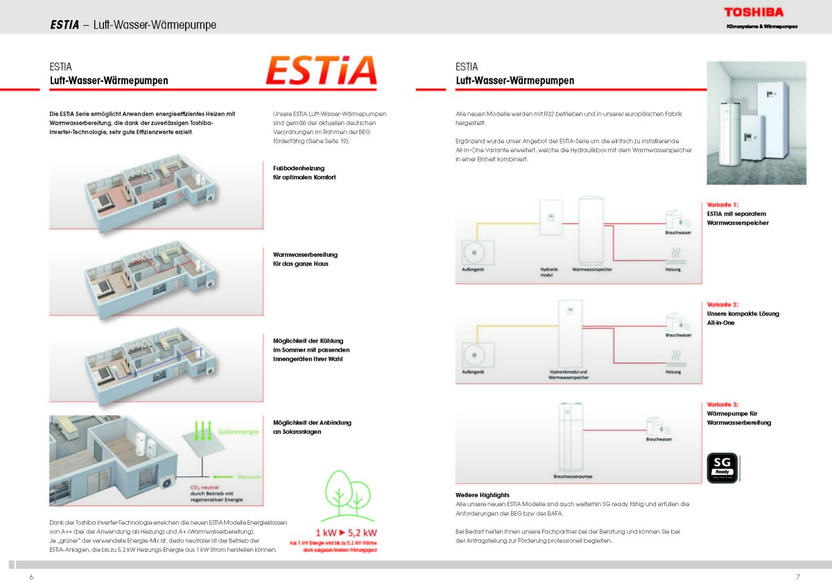 Die Erwärmung des Brauchwassers und die Bereitstellung der Heizenergie geschehen zuverlässig, effizient und leise. Die Toshiba ESTIA Wärmepumpe bietet mit Ihren kompakten Maßen eine flexible Installation auf engstem Raum. Die Einbindung in hybride Systeme, sowie die Implementierung von Solarenergie oder PV-Strom sind mit der Toshiba ESTIA Wärmepumpe unkompliziert möglich.