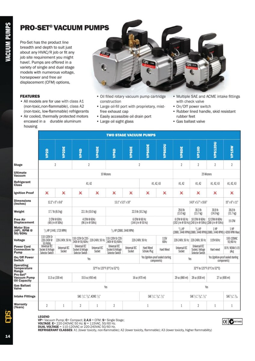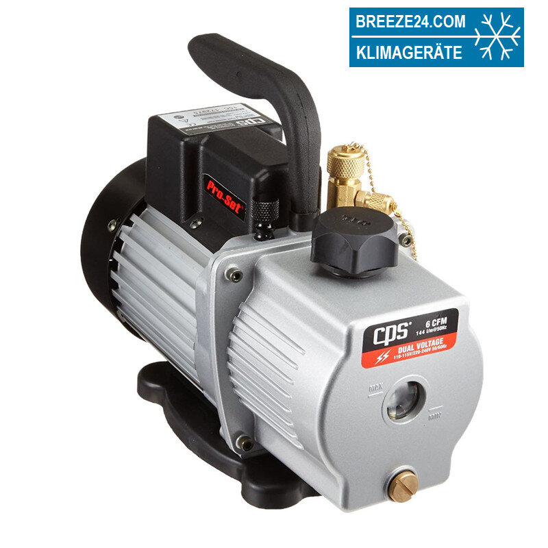 Die VP6DE Pro-Set® Vakuumpumpe ist eine zweistufige 6-CFM-Einheit mit einem vielseitigen 1/2-PS-Doppelspannungsmotor. Das Gerät verfügt über die gleichen hochwertigen Funktionen, die in allen Vakuumpumpen der Pro-Set® Premium-Serie enthalten sind und hervorragende Leistung und jahrelangen zuverlässigen Service bieten.